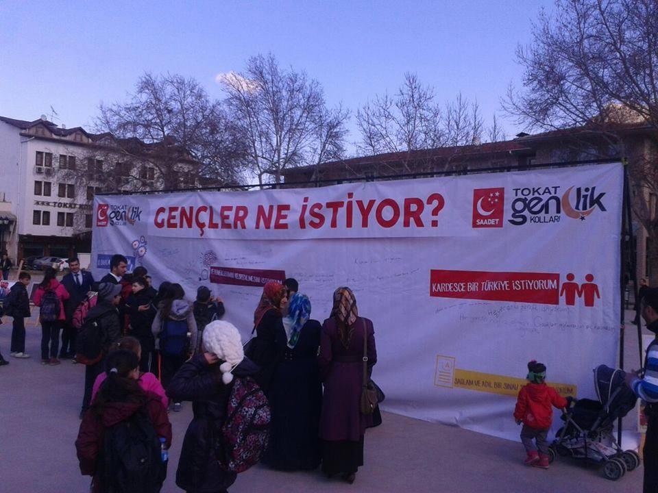 Saadet Partisi Tokat Gençlik Kolları olarak Tokat'taki genç kardeşlerimizin görüş, istek ve taleplerini özgürce ifade edebileceği bir fikir duvarı oluşturduklarını ifade eden Erdem, "Yapmış olduğumuz bu fikir duvarı çalışmasını 26-27-28 Şubat ve 1 Mart tarihine kadar genç kardeşlerimizin istifadesine sunuyor ve fikir duvarımıza davet ediyoruz. Fikir duvarımıza yazılan her düşünce noktası ve virgülüne varıncaya kadar döküman haline getirilip Genel Merkezimiz ve gerekli mercilere ulaştırılacaktır. Bütün Tokat halkımızı “Fotoğraf Sergisi ve Fikir Duvarı Platformu”na davet ediyoruz" diyerek sözlerini tamamladı.