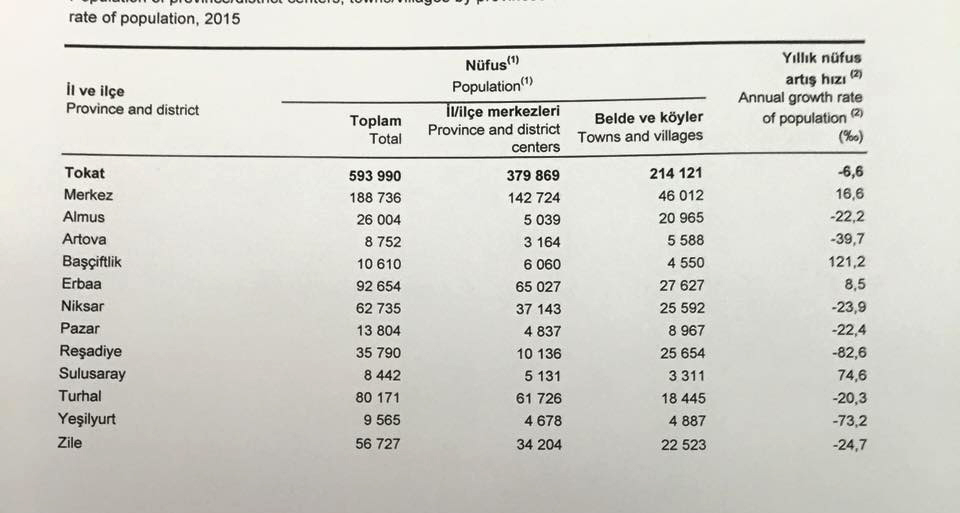 TÜİK Adrese Dayalı Nüfus Kayıt Sistemi Sonuçlarını açıkladı. Erbaa nüfusunu 3 bin 160 kişi artırarak Tokat’ın en büyük ilçesi oldu.2015 sonuçlarına göre Tokat’ın nüfusu bir önceki yıla göre 3930 kişi azalarak 593 bin 990 olarak gerçekleşti. Tokat’ın merkez nüfusu bakımıyla en büyük ilçesi son nüfus sayımına göre Erbaa oldu. 2014’de 91 bin 873 kişi olan genel Erbaa nüfusu 2015’de 92 bin 654 olarak gerçekleşti. En büyük artış Erbaa ilçe merkezinde yaşandı. 2014’de 61 bin 867 kişilik merkez nüfusuyla Turhal’dan sonra en kalabalık ikinci ilçe olan Erbaa 2015’de nüfusunu 3 bin 160 kişi arttırarak 65 bin 27 kişiye çıkardı. Erbaa genel ve merkez nüfus bakımından Tokat’ın en kalabalık ilçesi oldu.2014 yılında 62 bin 476 olan merkez nüfusu ile merkez nüfusu bakımından Tokat’ın en büyük ilçesi olan Turhal’ın nüfusu 750 kişi azalarak 61 bin 726 oldu. İlçe geneli nüfus ise 80 bin 171 kişi olarak gerçekleşti.