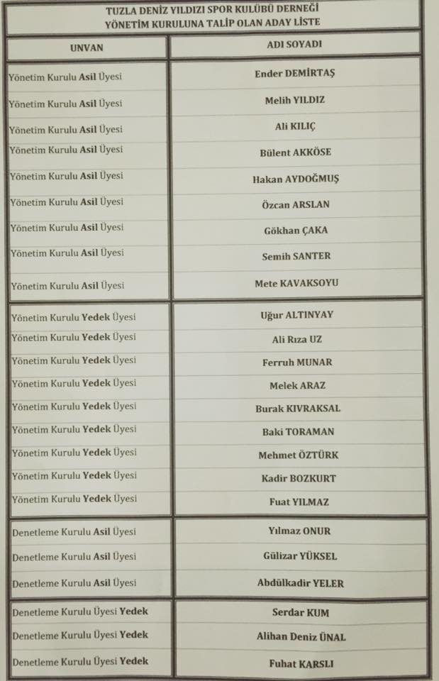 30.01.2016 Tarihinde Yapılan Tuzla Deniz Yıldızı Spor Kulubü Başkanlığına Seçilmiş Bulunmaktayım. Öncelikle Beni Bu Göreve Layık Gören Çalışma Arkadaşlarımıza ve Üyelerimize Teşekkür Ederim. Sonrasında Ricalarımı Kırmayarak Yönetimimizde Görev Alan Tüm Dostlarıma Teşekkür Ederim.