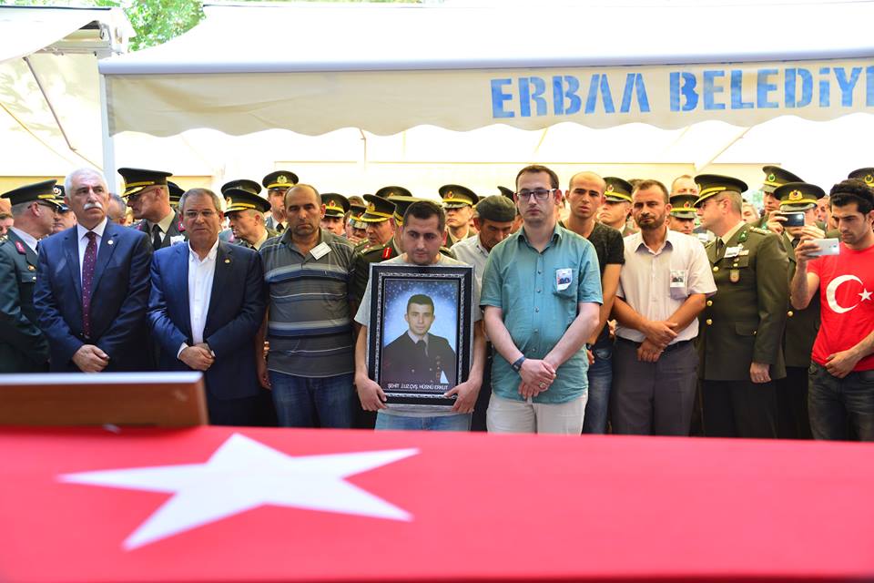 Hakkari'de yol kontrolü yapan askerlere yönelik düzenlenen saldırıda 8 silah arkadaşı ile şehit düşen 23 yaşındaki Jandarma Uzman Çavuş Hüsnü Erkut'un cenazesinde acılı babanın feryatları yürekleri dağladı. Şehit oğlunun fotoğrafını havaya kaldırarak giren baba Mehmet Erkut, oğlunun mertçe, şereflice vatanı için şehit olduğunu belirterek, "Dostlar, vatan sağ olsun. Vatanı, milleti için şehit oldu, benim oğlum. Böyle bir evlat yetiştirdiğim için gururlu hissediyorum kendimi. Vatanım sağ olsun. Vatanım sağ olsun" dedi.